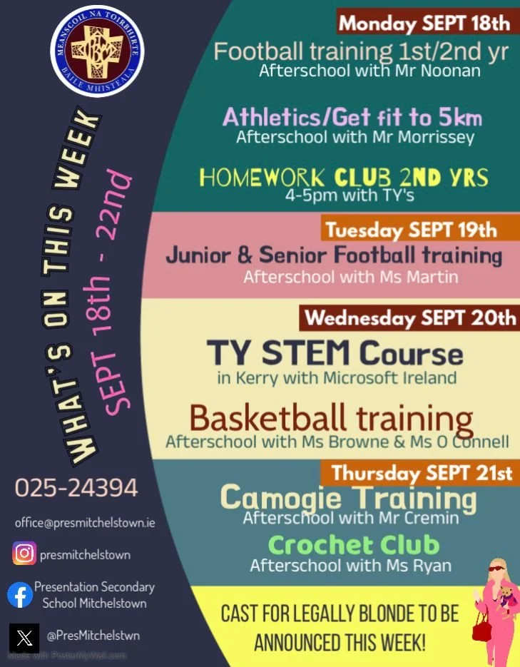A busy week ahead for us in Pres! Many after school activities & events planned with something for everyone. Thanks to our dedicated staff who volunteer their time to give our students the opportunity to develop skills & enjoy time with friends!